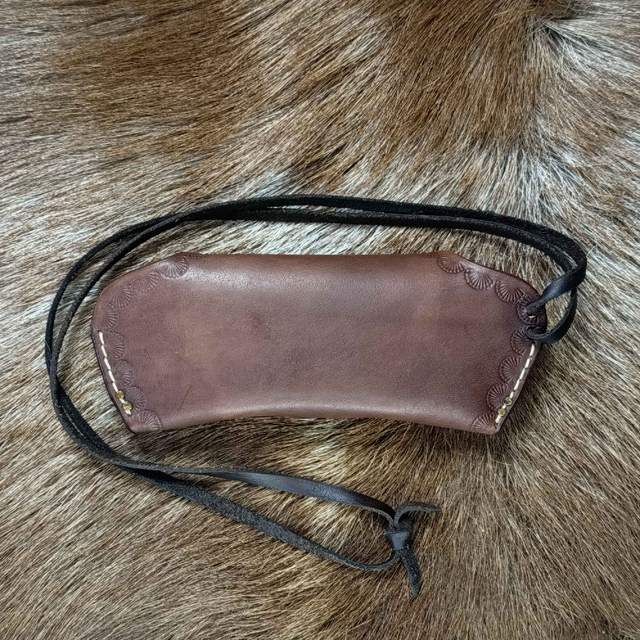 Ručne vyrobené kožené puzdro na okuliare z kvalitnej hovädzej kože. Každý kus vzniká tradičnými remeselnými postupmi – ručné rezanie, tvarovanie, zdobené a šité. Puzdro je zdobené jemným tlačeným vzorom a uzatvárané kovovým cvokom, ktorý spoľahlivo drží okuliare na svojom mieste.