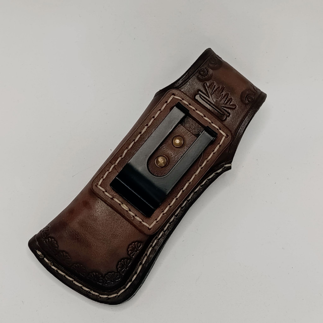 Ručne vyrobené kožené puzdro na skladací nôž z kvalitnej hovädzej kože. Každý kus vzniká pomaly, tradičnými remeselnými postupmi – ručné rezanie, tvarovanie, zdobenie a šitie. Puzdro je zdobené tlačeným vzorom a uzatvárané kovovým cvokom, ktorý bezpečne drží nôž na svojom mieste.