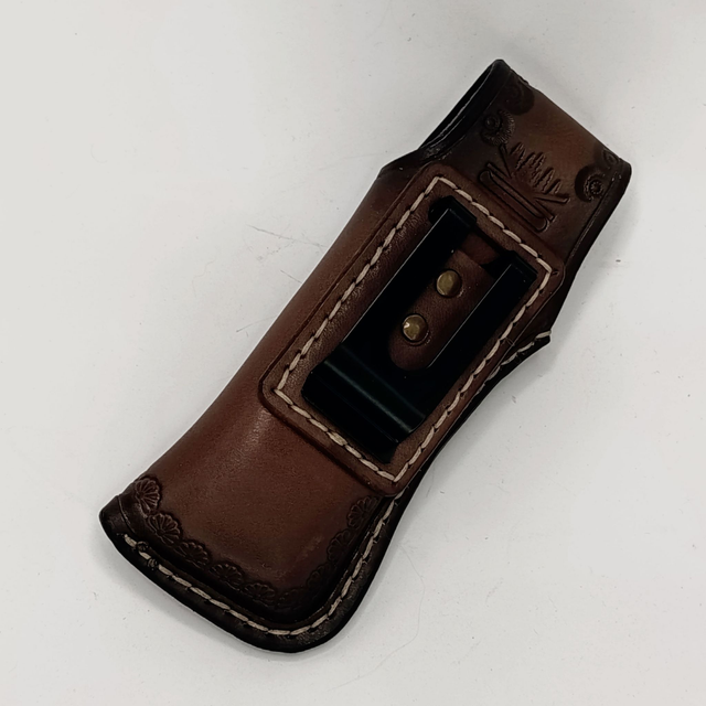 Ručne vyrobené kožené puzdro na skladací nôž z kvalitnej hovädzej kože. Každý kus vzniká pomaly, tradičnými remeselnými postupmi – ručné rezanie, tvarovanie, zdobenie a šitie. Puzdro je zdobené tlačeným vzorom a uzatvárané kovovým cvokom, ktorý bezpečne drží nôž na svojom mieste.